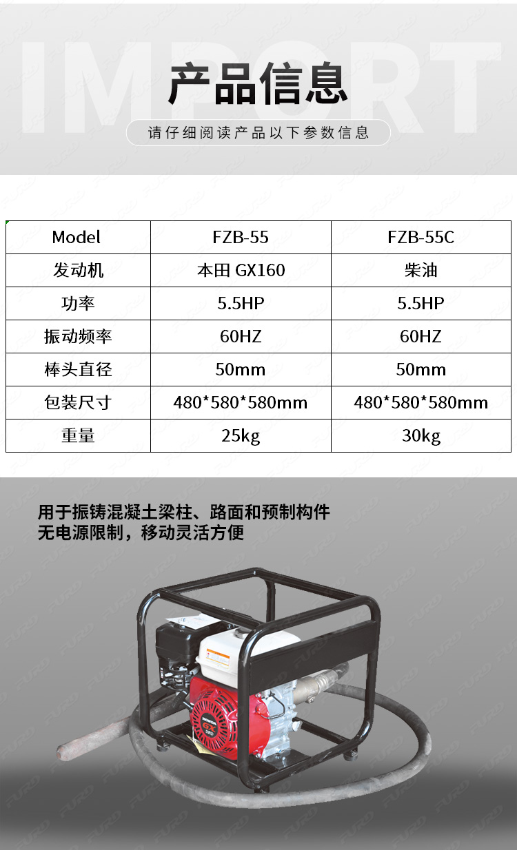 用于振鑄混凝土梁柱、路面和預(yù)制構(gòu)件。 無電源限制,移動(dòng)靈活方便。