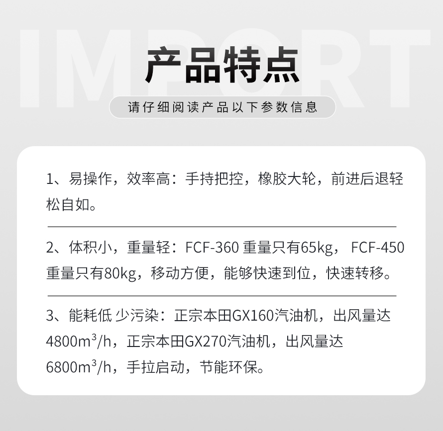 FCF-450路面吹風機采用本田汽油動力,性能穩(wěn)定。風葉動力平衡性強,保證整體的穩(wěn)定性。大風量,性能優(yōu)越。